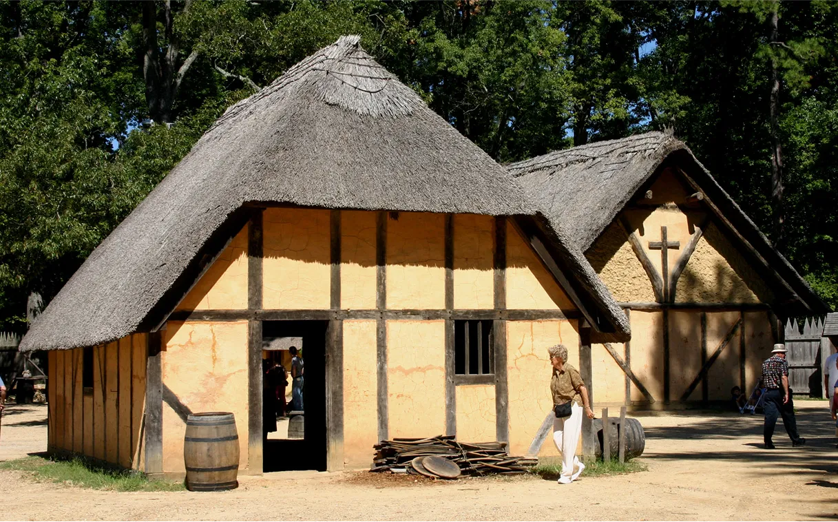 Few true colonial homes remain standing in Virginia. The Thoroughgood House (c. 1720) in Virginia Beach and Bacon’s Castle (1665) in Surry County are among the rare brick survivors, but even these are exceptional and not representative of the typical colonial dwelling. Most surviving evidence comes from archaeological sites, such as the remains of early Jamestown buildings, where post-hole patterns reveal the outlines of earthfast houses.