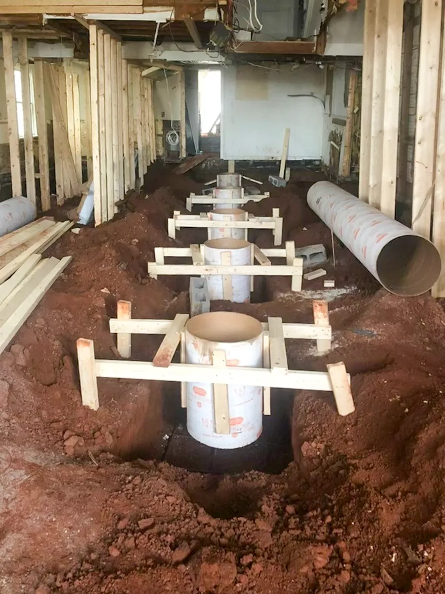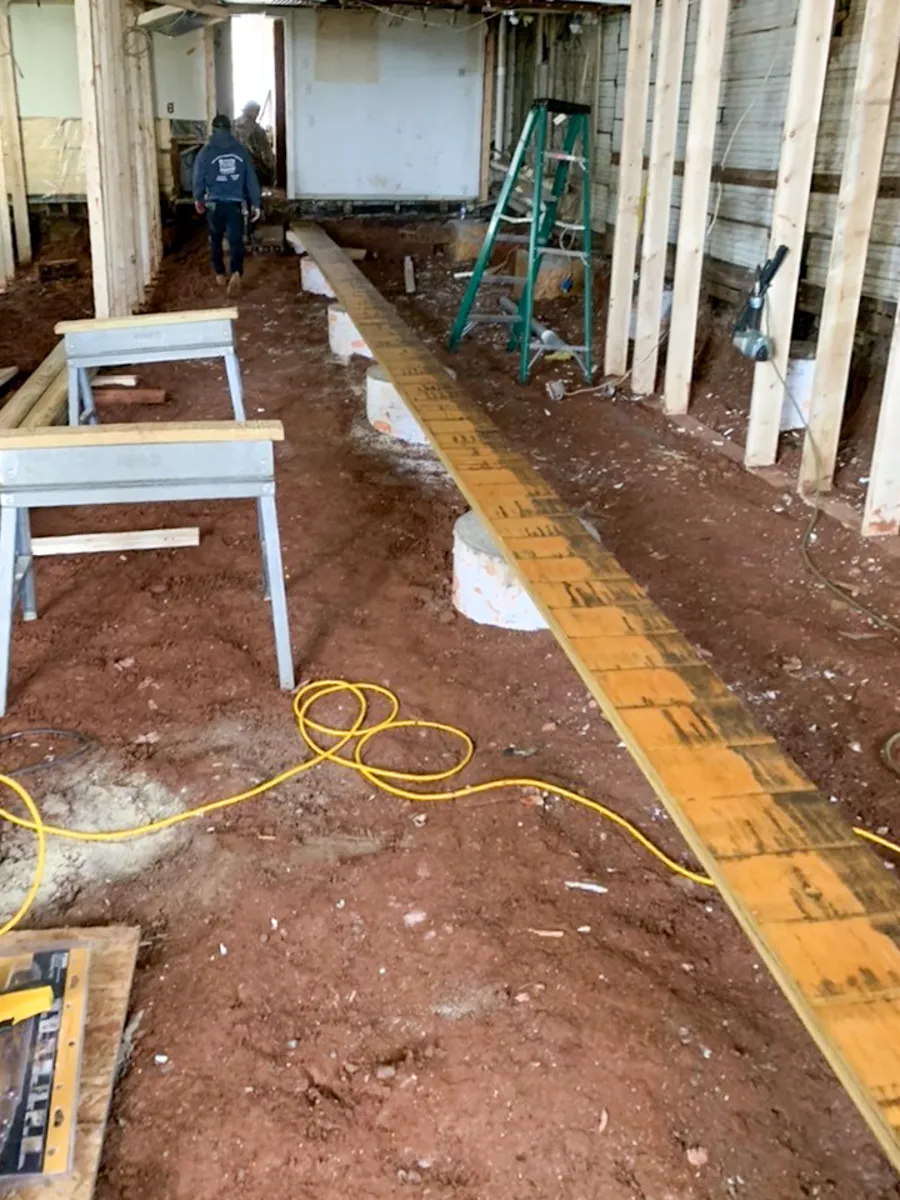 - We rebuilt this historic structure from the inside out. This historic property was built on no foundation, just beams placed into the ground. Over 100+ years, these beams began to rot. We temporarily supported the building, removed the front wall of the building, excavated 30” of dirt from the entire footprint of the building, and hauled this off to a nearby farm.