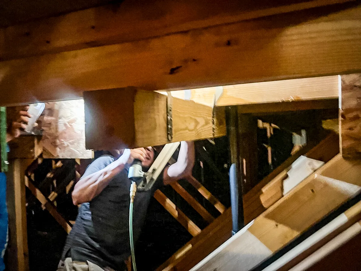 - Removed the roof and dropped the engineered post from the attic down to the first floor, and braced all corners.