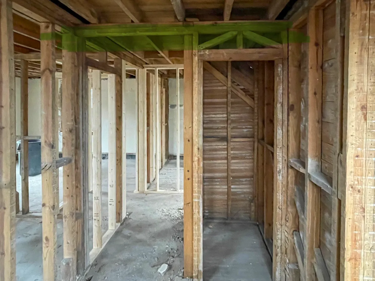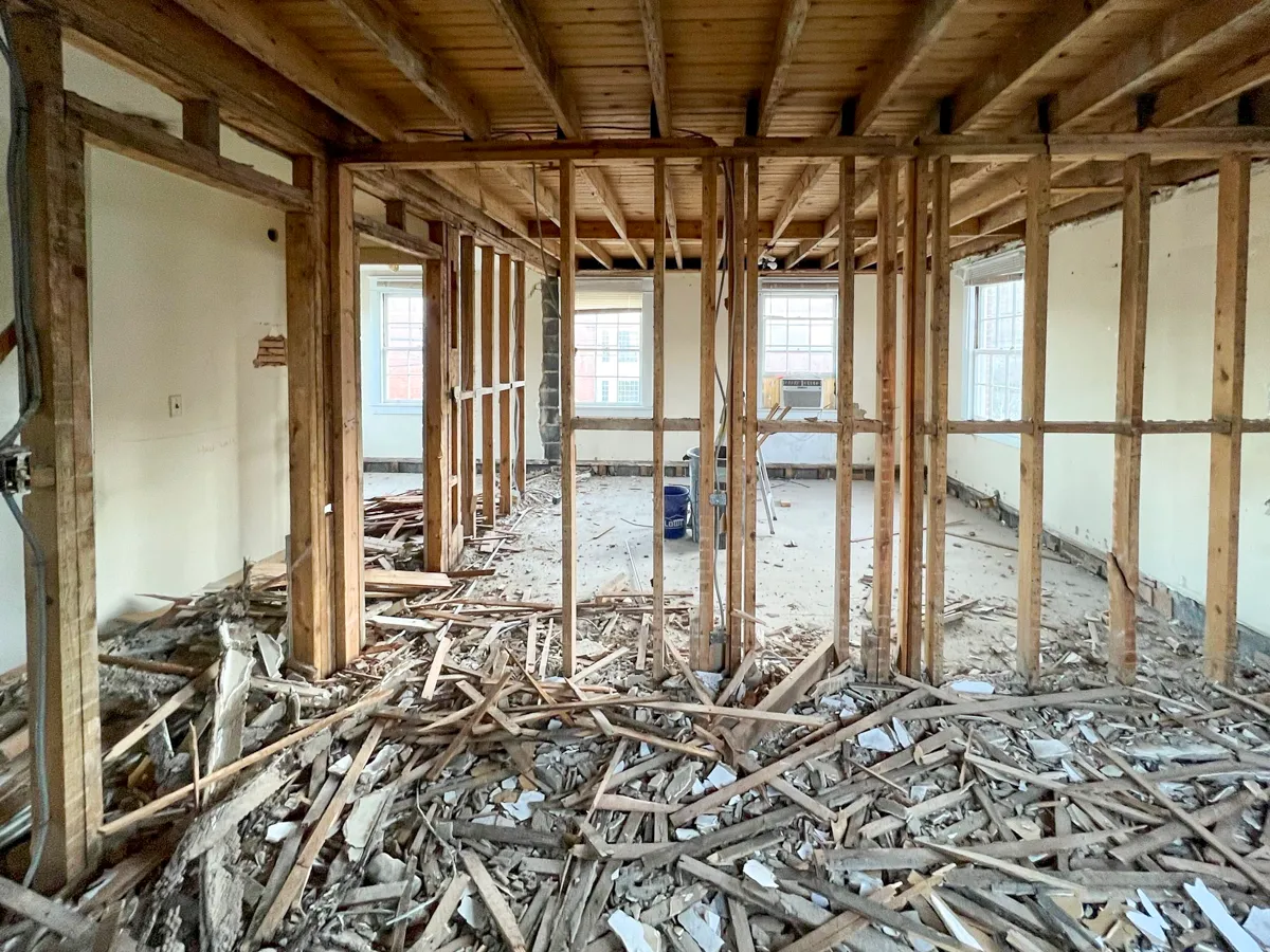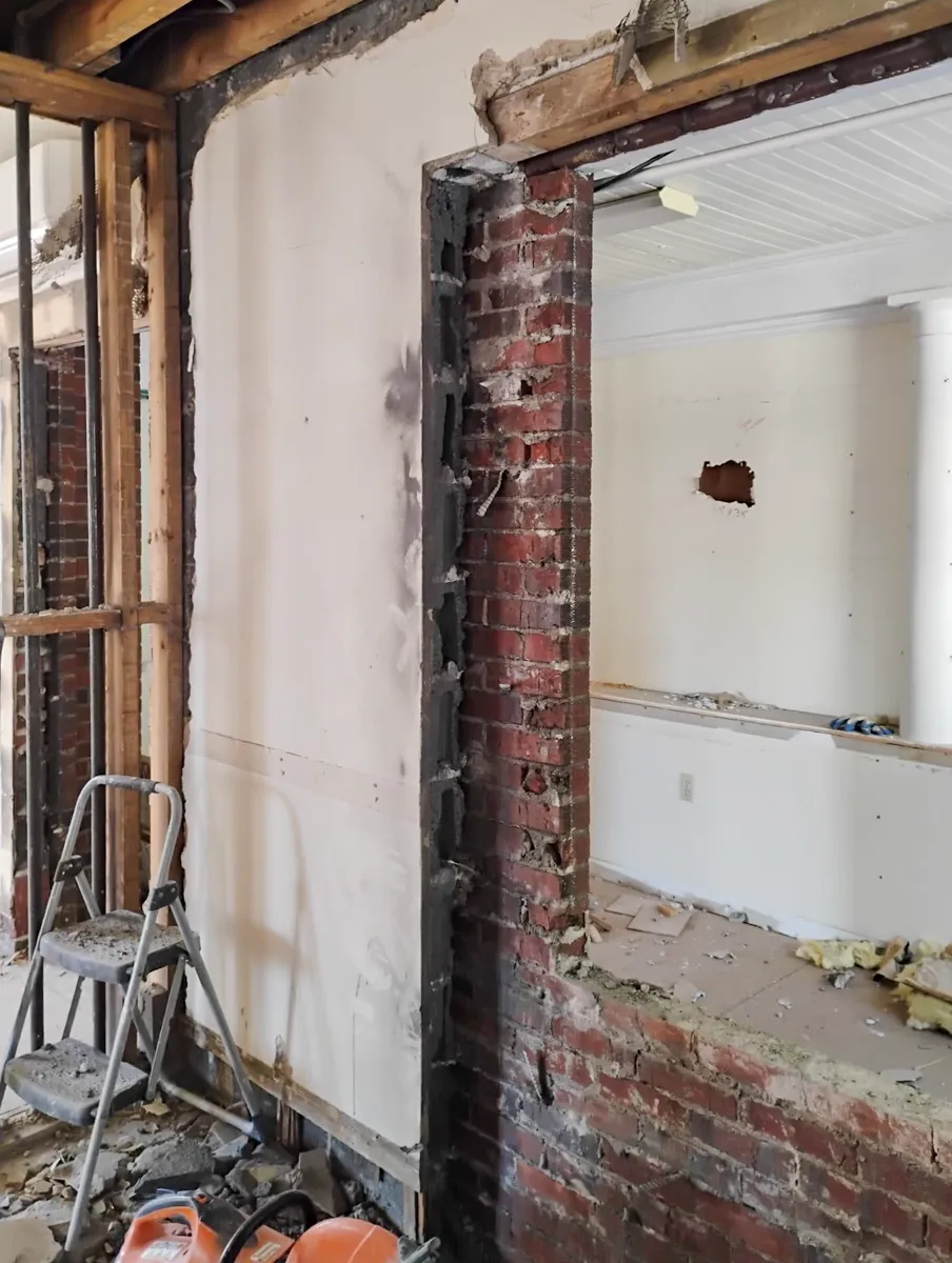- We demoed an existing brick wall for an opening to a future studding room. Reframed study’s exterior wall to receive three new windows bringing in natural light.