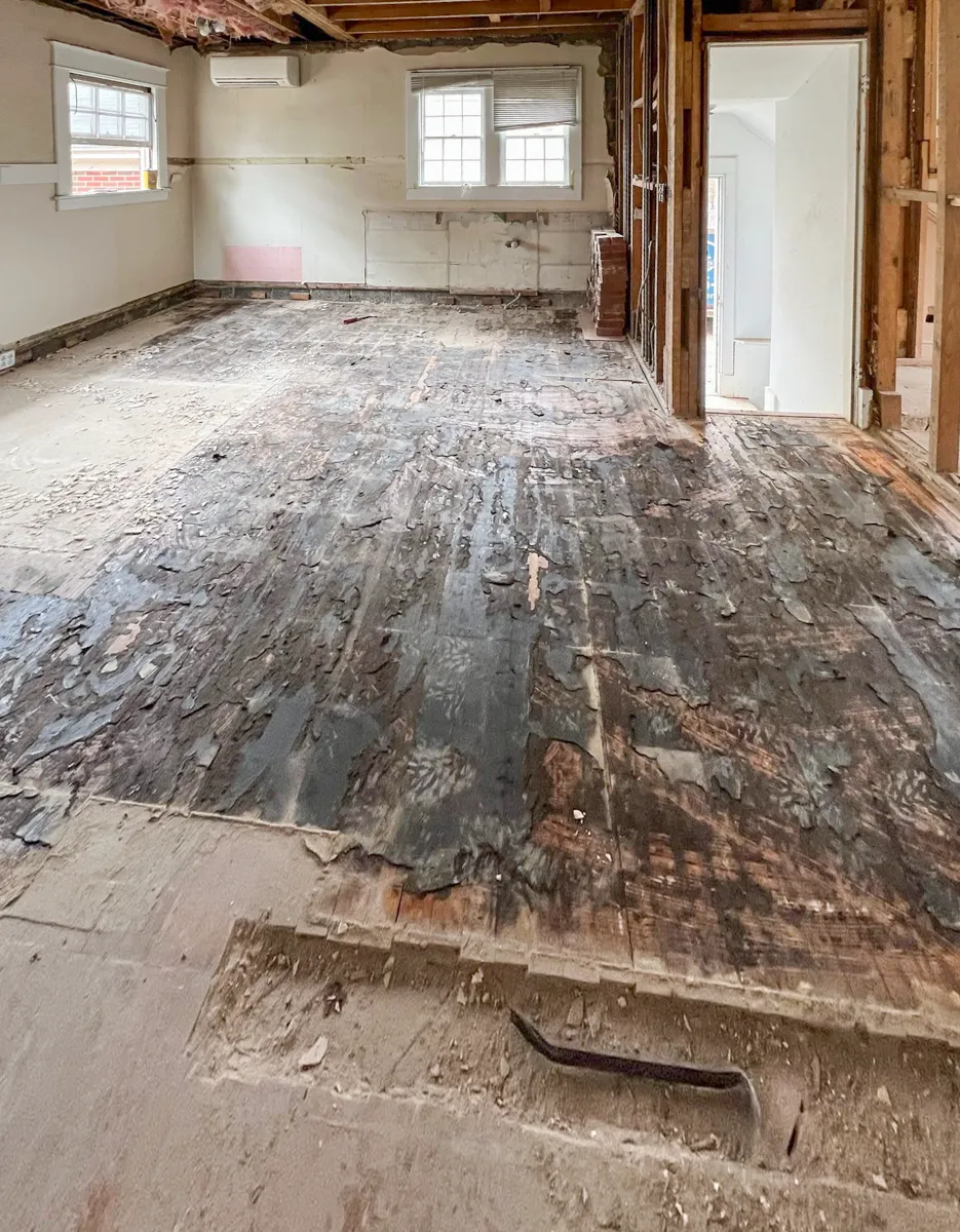 - We demoed several layers of existing flooring to discover a two-inch oak floor resting on top of a 45-degree 1”x6” subfloor - standard for this time. After we discovered it we matched that flooring profile, and matched it with the entire layout.