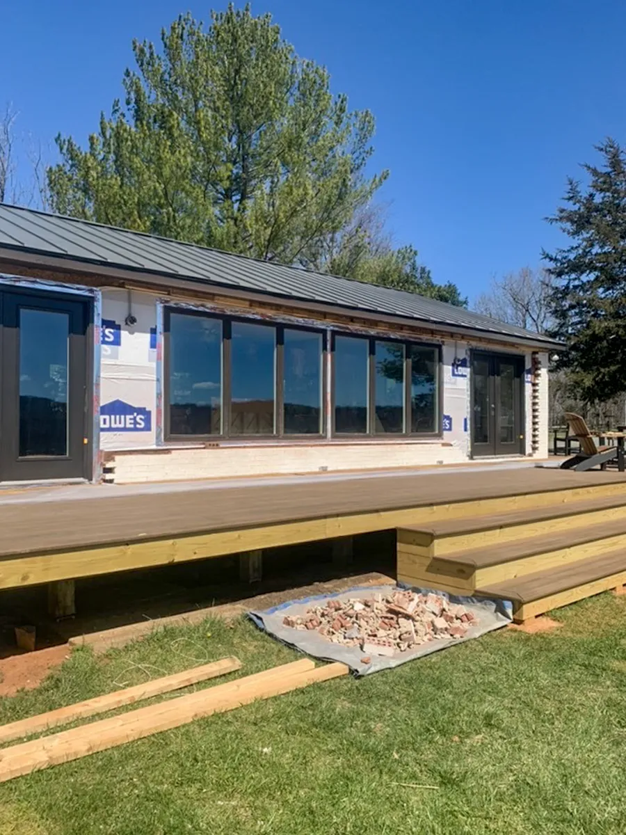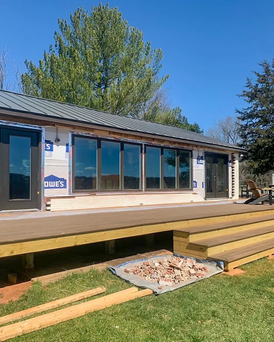 This full home remodel in Stoney Point completely reshaped the front façade and interior layout. Work included reframing a 50-foot front elevation for a custom Marvin window glass package, reinstalling the original brick, enclosing a porch, and updating interior walls to bring extensive natural light and new views of the pastures and pond.
